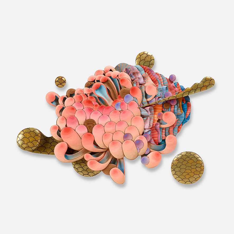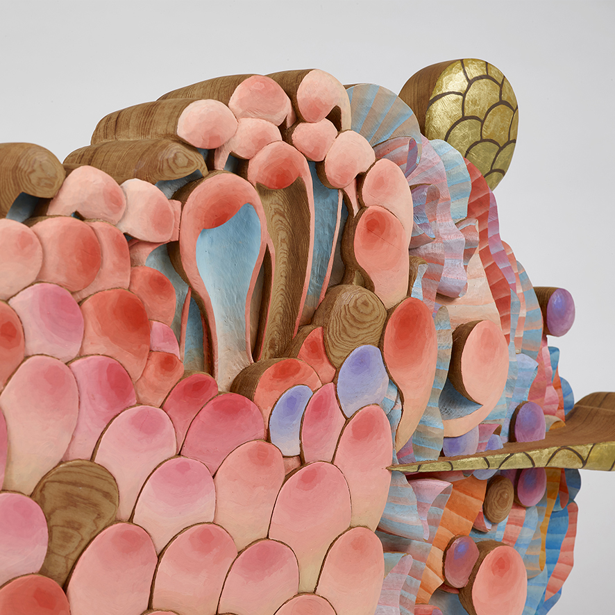 《華麗曼波》是香杉木,我們將木料裁切成巨型的球狀花型,造型靈感來自牡丹菊,彩繪過程裡,特別留下幾片沒有上色的花瓣,露出木頭的紋路,質感溫潤,豐盛又典雅的造型搭配金色,非常華麗。