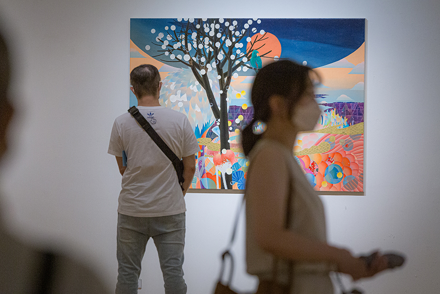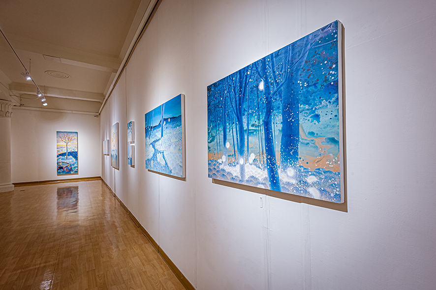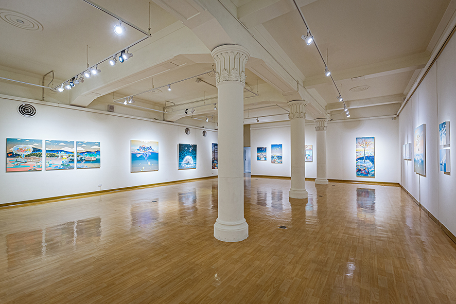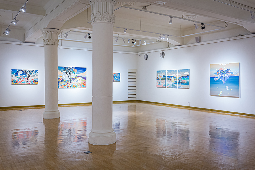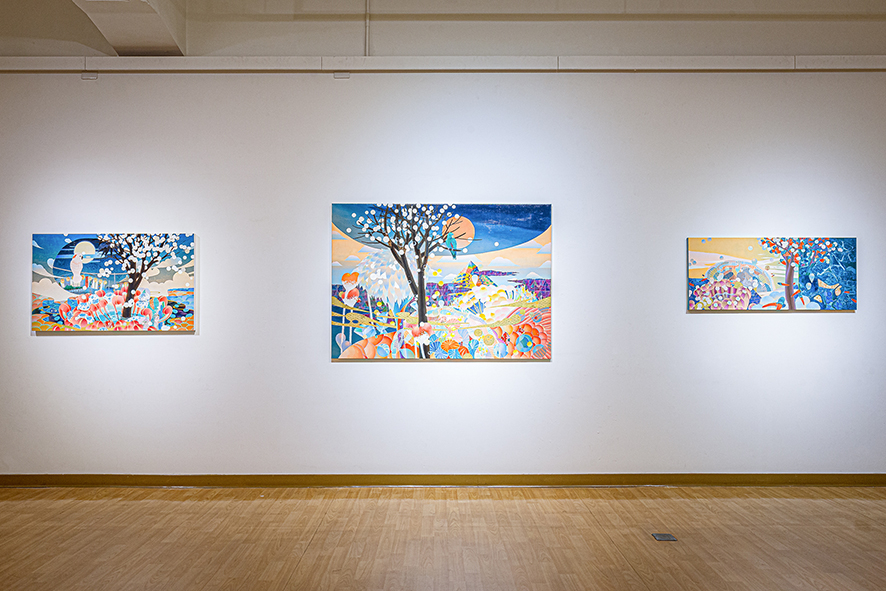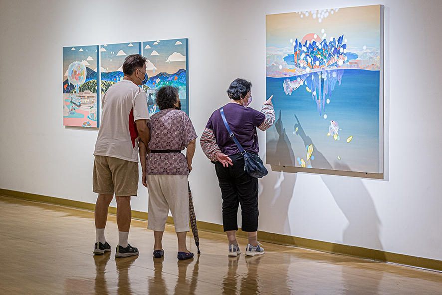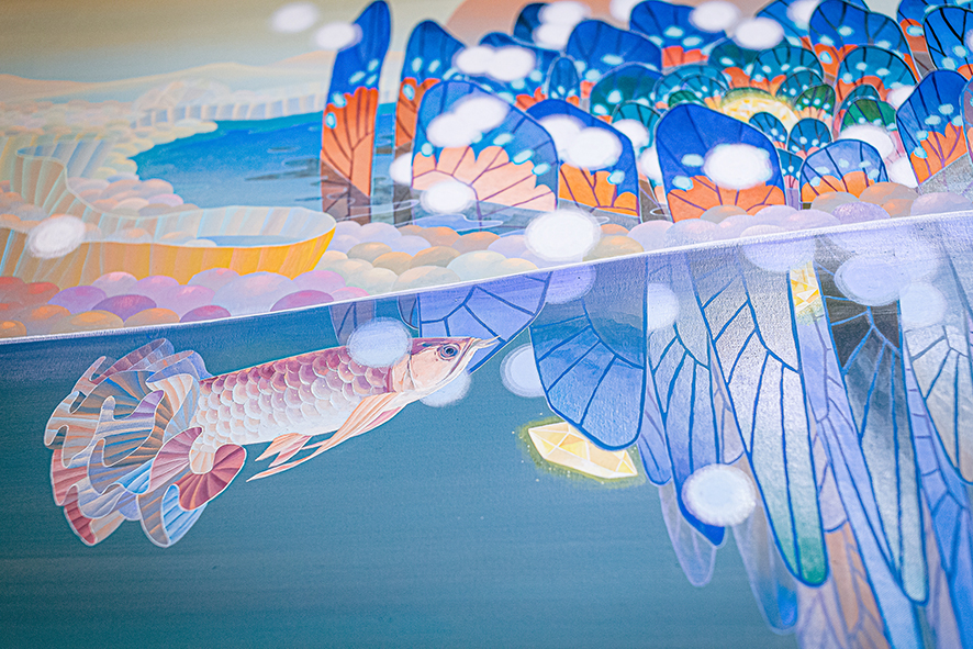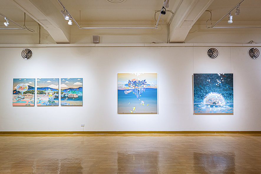 黃柏勳的作品總是描繪著風景,一些看似熟悉卻又完全不知所在,另一些彷彿只有在宮崎駿的動畫中才會出現,再另一些則是彷若夢境般的場景。風景中交織著盛開的繁花、搖曳的枝葉、縹緲的遠山、湛藍的蒼穹或海洋、粉嫩的雲彩與霞光、間或出現飛鳥、游魚、海中生物、走獸、舞蝶、點點螢火,也不乏隱隱然透出燈光的驛站、小屋、店鋪或奇幻的建築體,但卻總是杳無人跡,就算有也是與真實脫節的木製人偶。過去三年,當我們或多或少的因為疫情被軟禁在家,斷絕旅行與逃離現實的可能,我們應該為能重新審視自我而感到高興,還是擔心縮小的空間與視野會導致退縮?黃柏勳則似乎無懼於空間與視野的限制,繼續不斷的建構並悠遊於許許多多的「他方」。