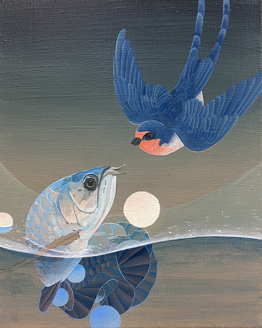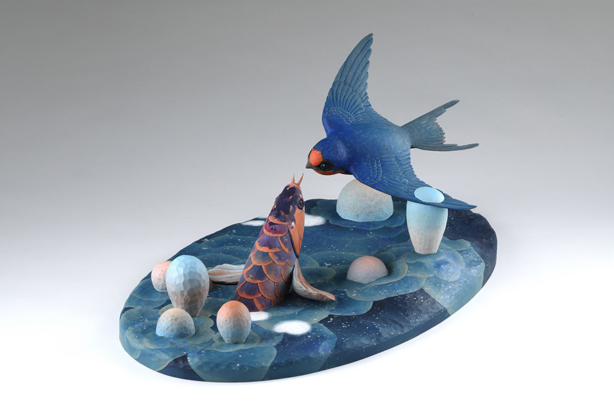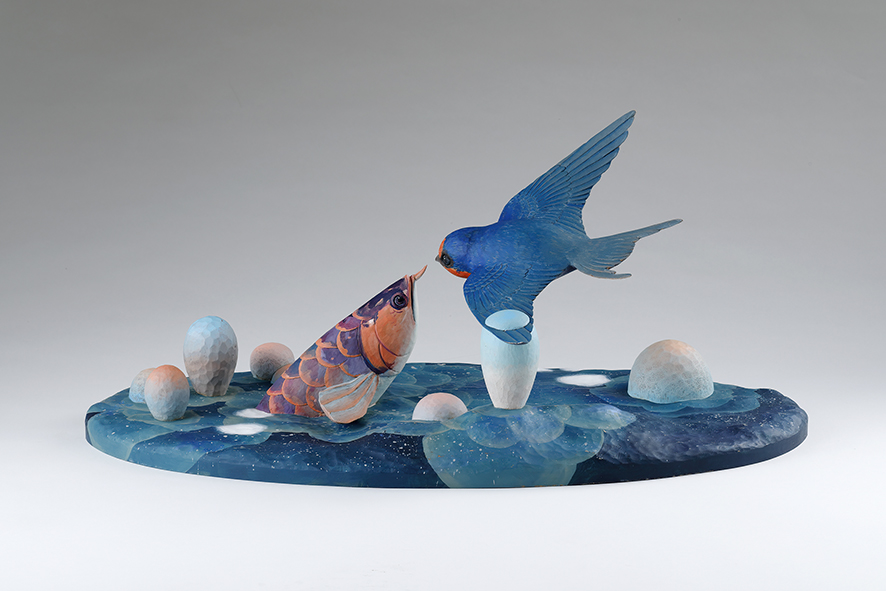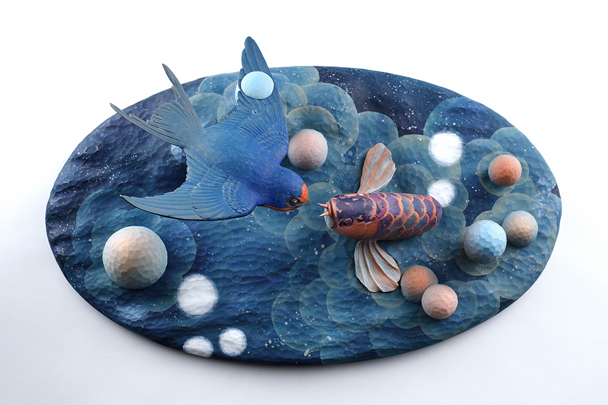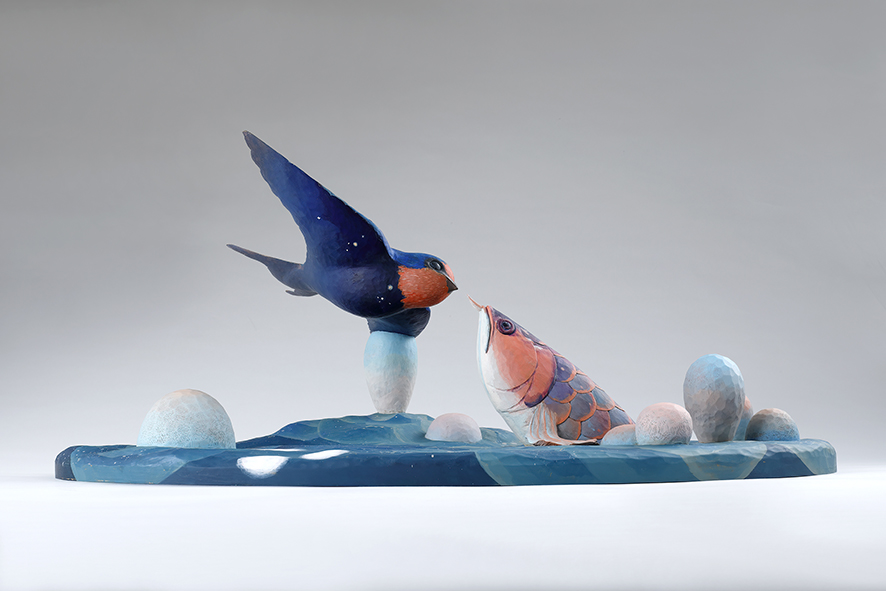 因為有很好的機緣,於是有了這次的專案計畫。彩繪結合木刻,讓作品內反覆出現的龍魚和燕子得以實體化,是創作以來的初次嘗試。