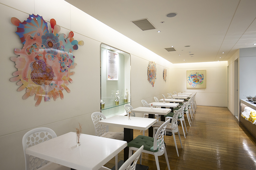 位於台北市天津街的丹迪旅店,這次與黃柏勳合作,以「粉紅漫遊」為主題,藉由藝術作品的進駐,將餐廳美化。