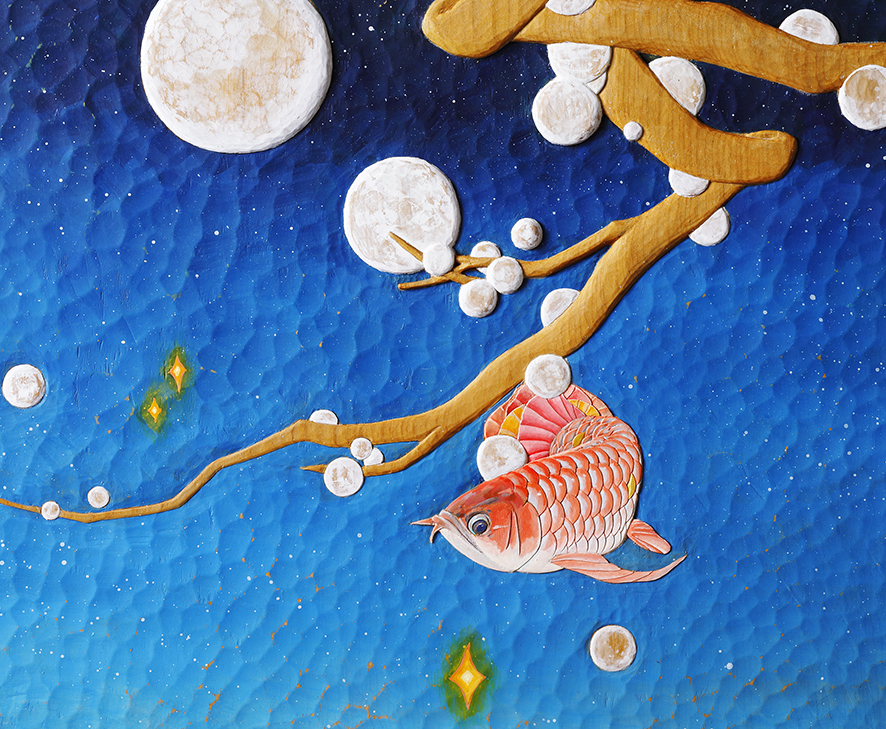 浮雕的種類很多,《漂浮島》和《歸來仍是少年》是肖楠木製作的超淺浮雕。在極淺的厚度裡,表現深遠的空間的淺浮雕,兩件作品以黃柏勳最經典的「龍魚」和「燕子」兩個元素,討論生活範圍與自由的關係。這組作品也是《自由與凝望》概念的延續。
