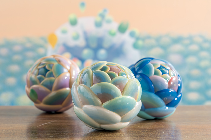 此外,在平面作品之外,黃柏勳也挑戰立體作品,他的雕塑在聚酯纖維造形的素胚上彩繪,模糊了雕塑與繪畫的邊界。他更進行了一百顆彩繪花球的《繁花盛開計劃》,迎戰介於雕塑、繪畫、工藝與物件之間的界線。