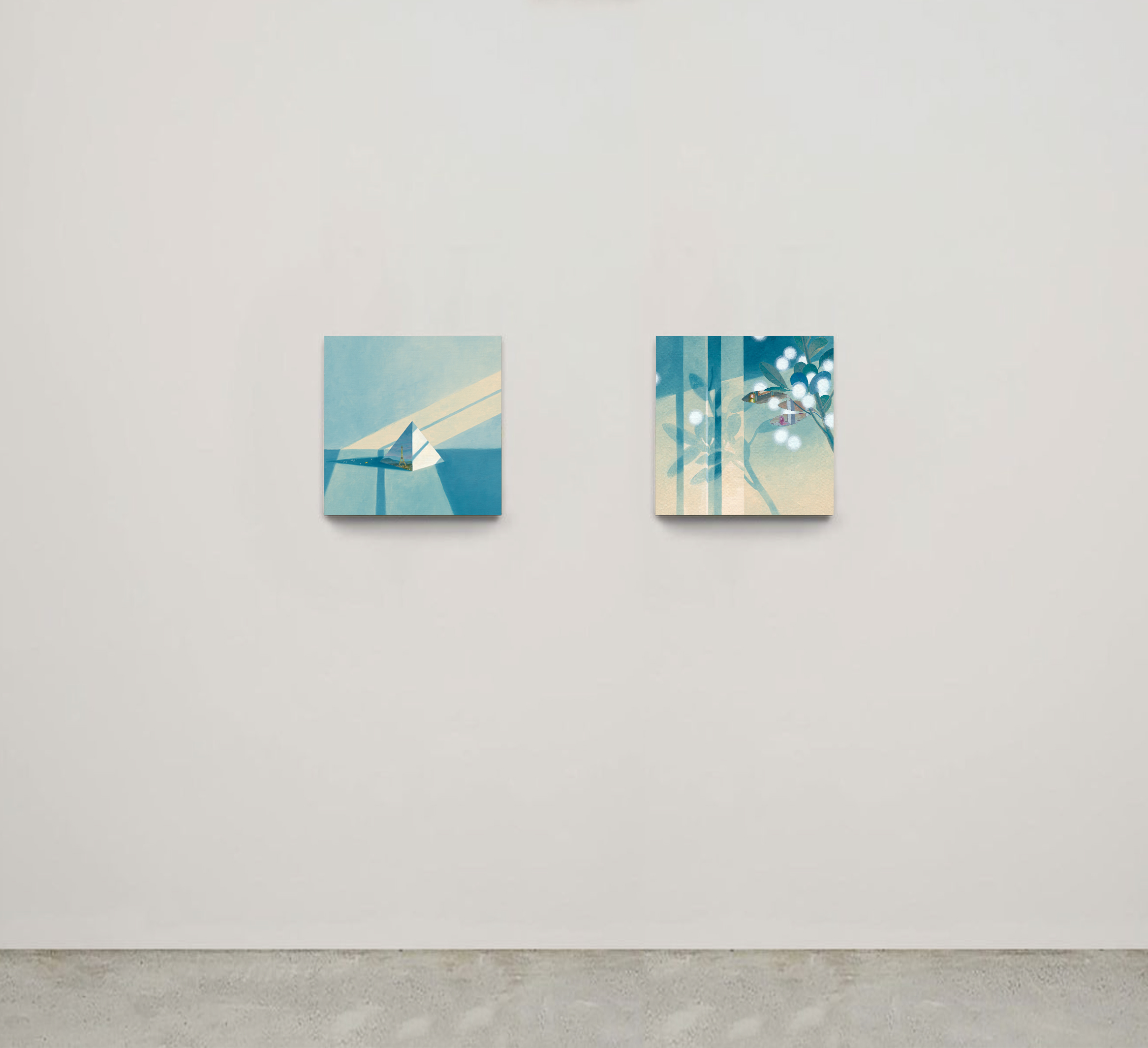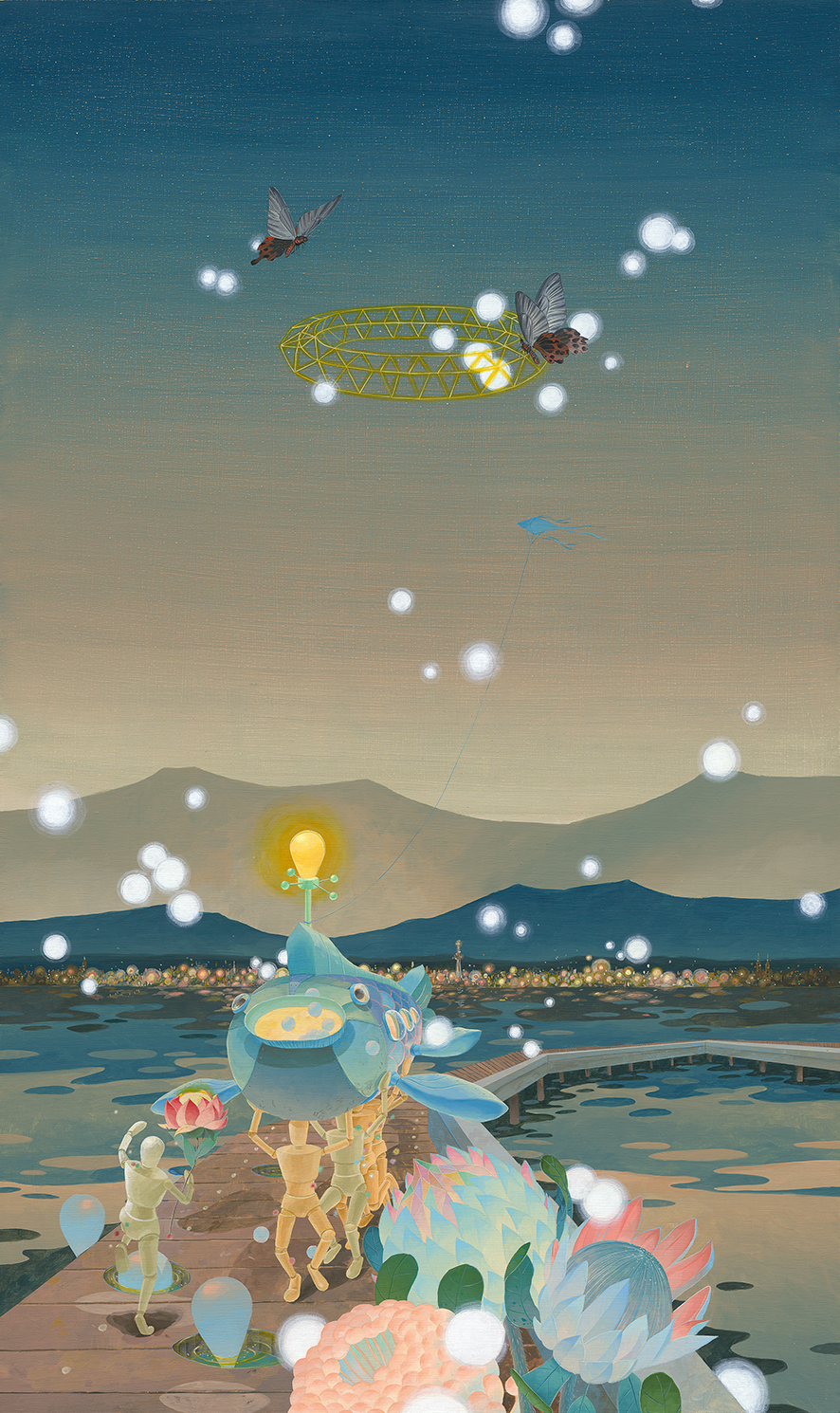 黃柏勳的作品總是描繪著風景,一些看似熟悉卻又完全不知所在,另一些彷彿只有在宮崎駿的動畫中才會出現,再另一些則是彷若夢境般的場景。風景中交織著盛開的繁花、搖曳的枝葉、縹緲的遠山、湛藍的蒼穹或海洋、粉嫩的雲彩與霞光、間或出現飛鳥、游魚、海中生物、走獸、舞蝶、點點螢火,也不乏隱隱然透出燈光的驛站、小屋、店鋪或奇幻的建築體,但卻總是杳無人跡,就算有也是與真實脫節的木製人偶。過去三年,當我們或多或少的因為疫情被軟禁在家,斷絕旅行與逃離現實的可能,我們應該為能重新審視自我而感到高興,還是擔心縮小的空間與視野會導致退縮?黃柏勳則似乎無懼於空間與視野的限制,繼續不斷的建構並悠遊於許許多多的「他方」。