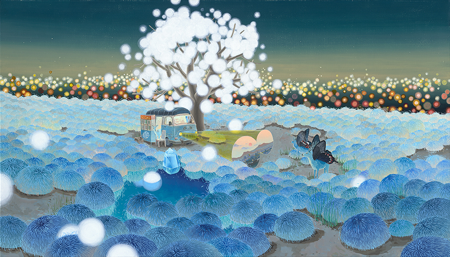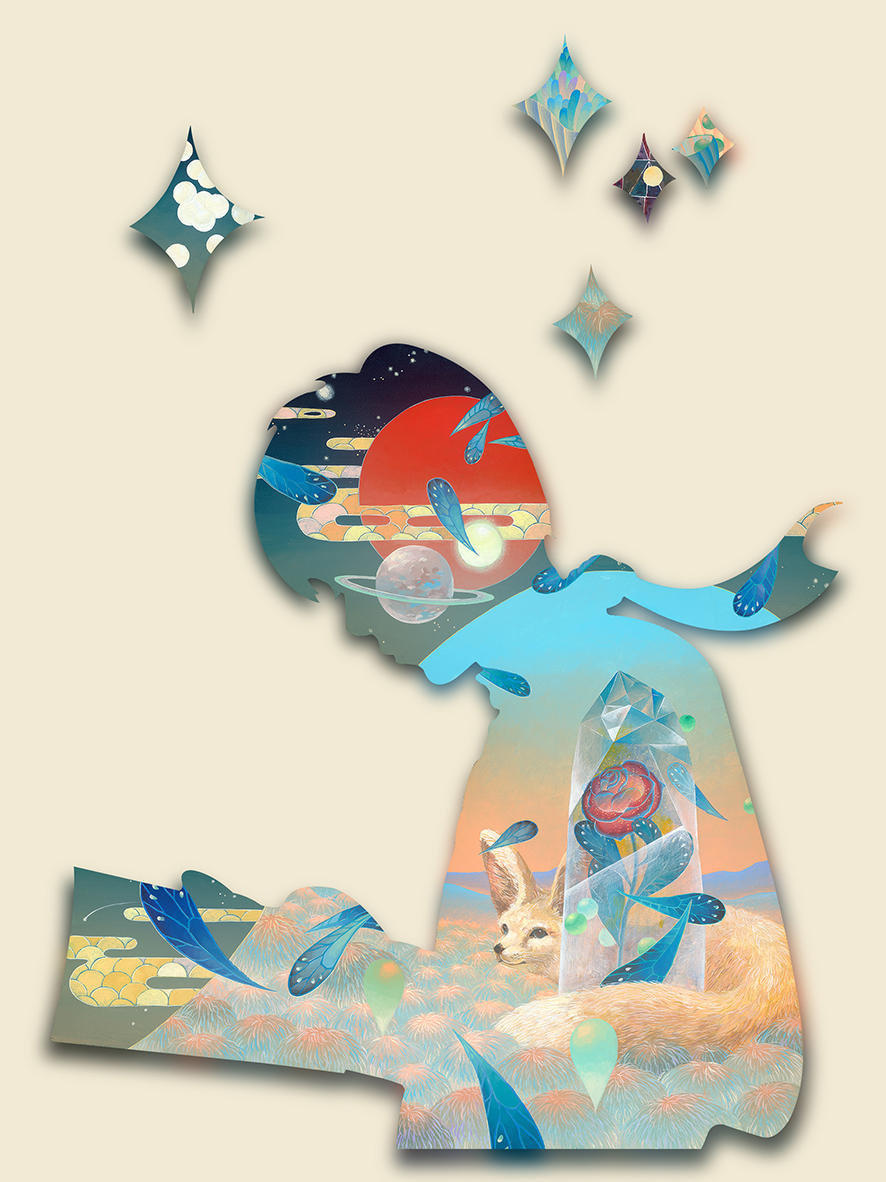 如果說,《小王子》一開始講述繪畫對觀者所提供的另類視野,以文字形構一場具有視覺畫面的遭遇,更深刻地勾勒愛與馴服的關係;那麼黃柏勳的繪畫,則向小說的華麗詞藻致敬,從文學與生活中覓得故事性的想像,以繪畫營造一場奇幻的旅程。
